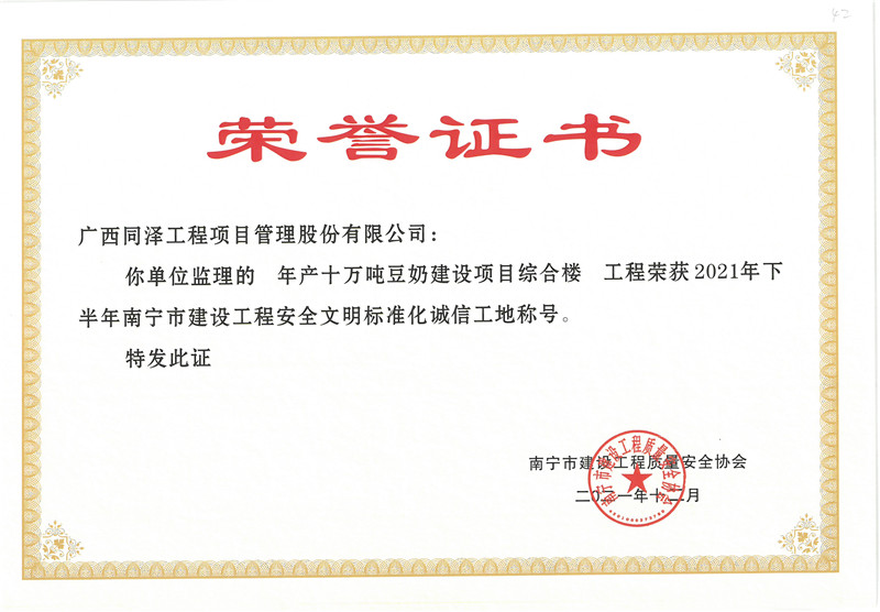 年產(chǎn)十萬噸豆奶建設(shè)項(xiàng)目綜合樓項(xiàng)目榮獲2021年下半年南寧市建設(shè)工程安全文明標(biāo)準(zhǔn)化誠信工地稱號(hào)